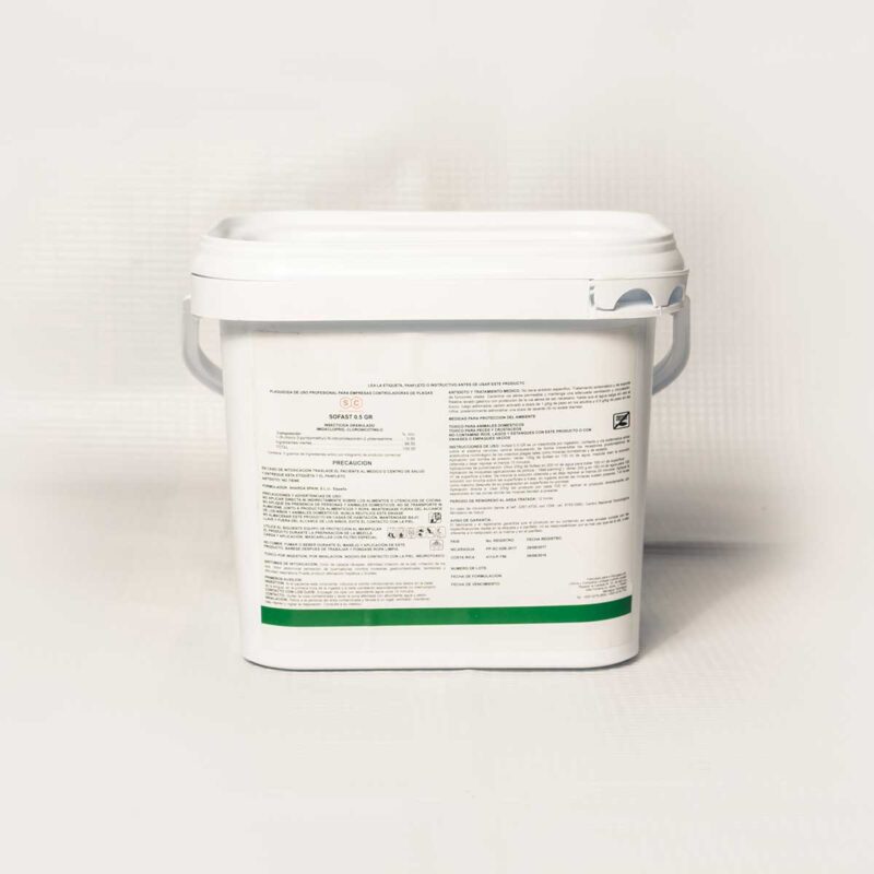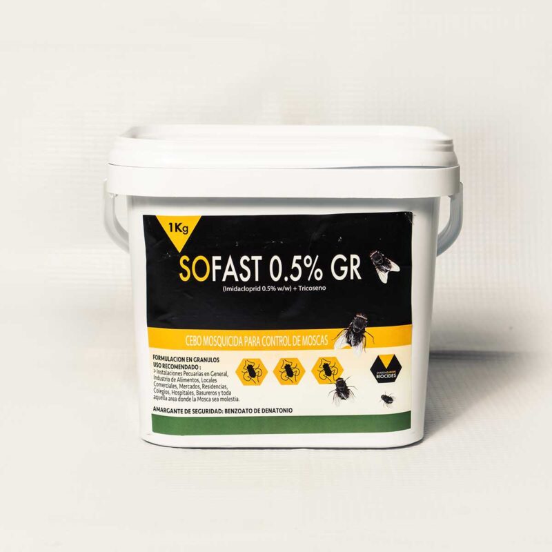 Sofast 0.5 GR es un insecticida que actúa por ingestión, contacto y vía sistemática. Actuando sobre el sistema nervioso central bloqueando de manera irreversible los receptores postsinápticos de acetilcolina nicotinérgico de los insectos plagas tales como moscas dome´sticas y de establos.